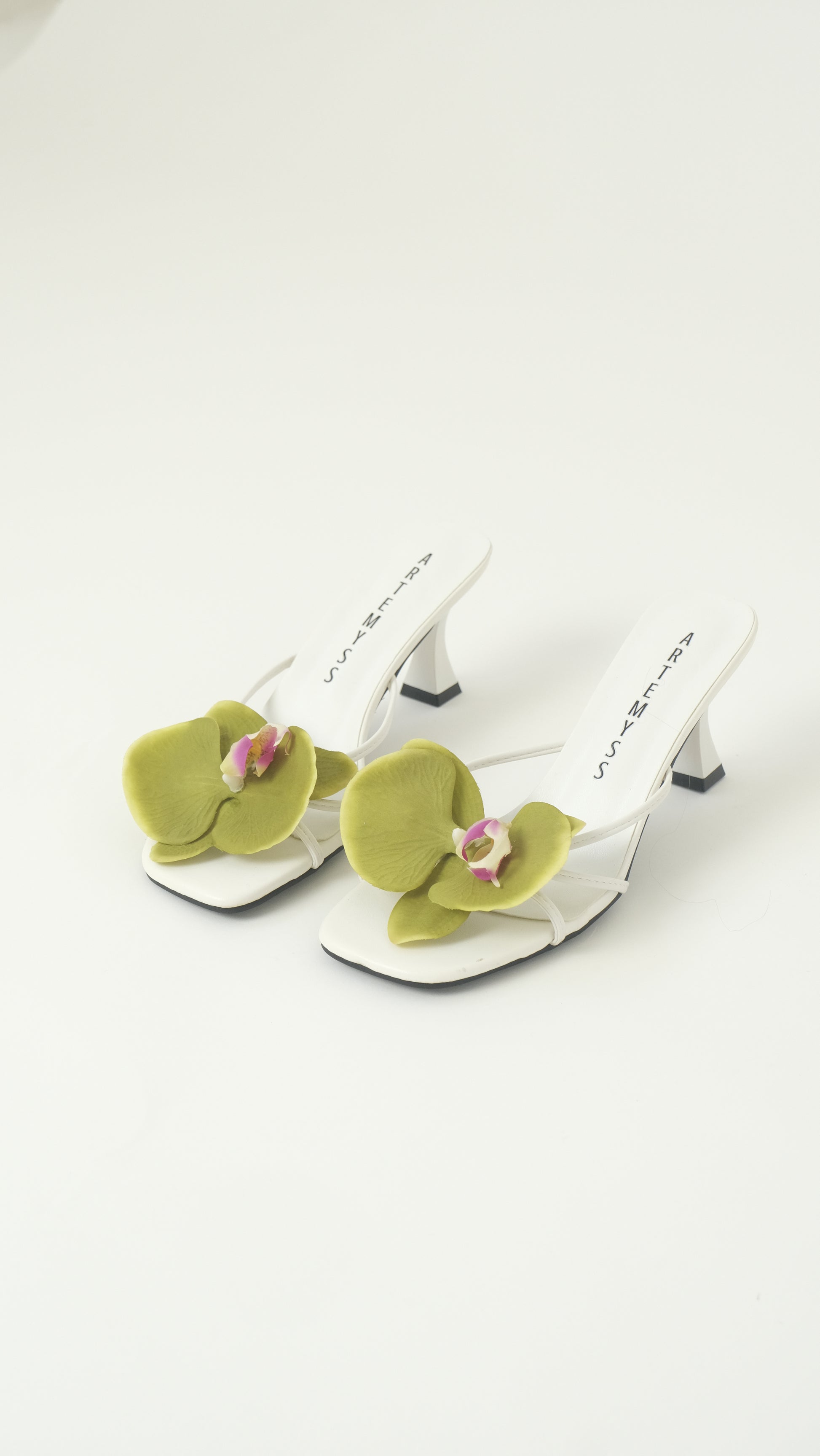 The Vivian sandal is designed with understated elegance in mind. Featuring a sleek double-strap silhouette, this open-toe heel is finished with delicately placed, real-touch orchid florals that echo the softness of nature.